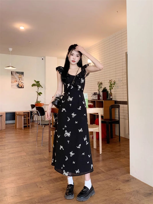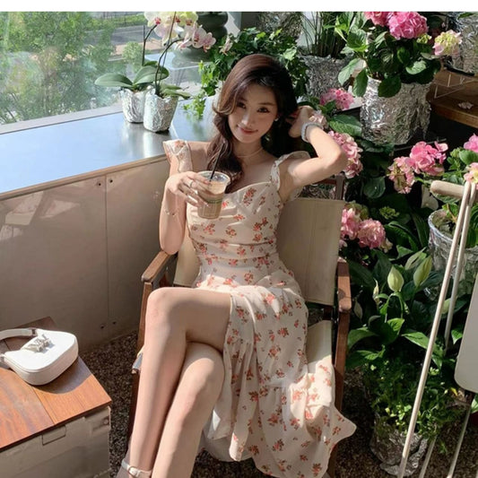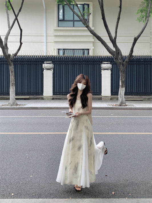 DS009 挂脖V领法式蕾丝碎花连衣裙