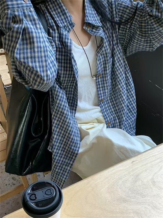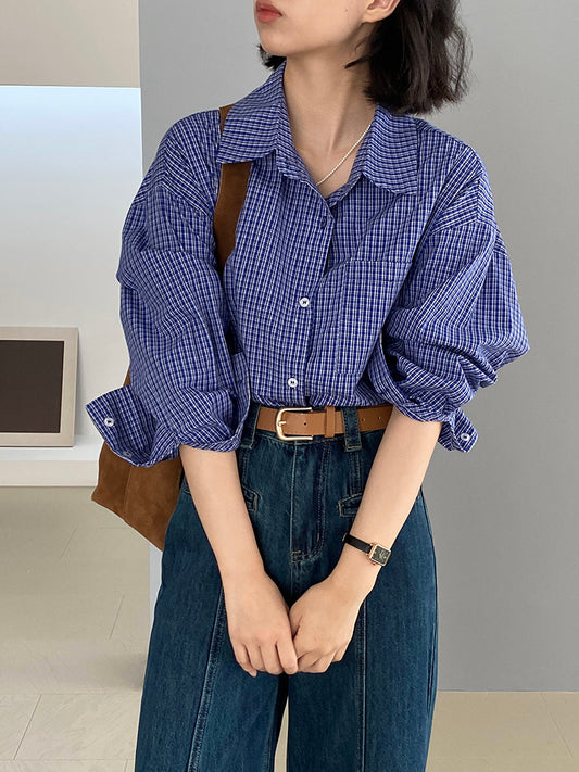 TP016 早秋复古蓝色格子衬衫