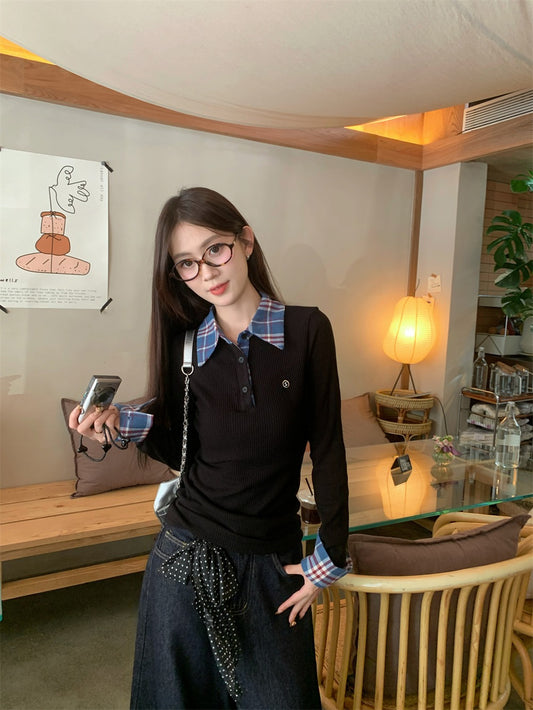 TP017 秋季假两件撞色格纹POLO领长袖