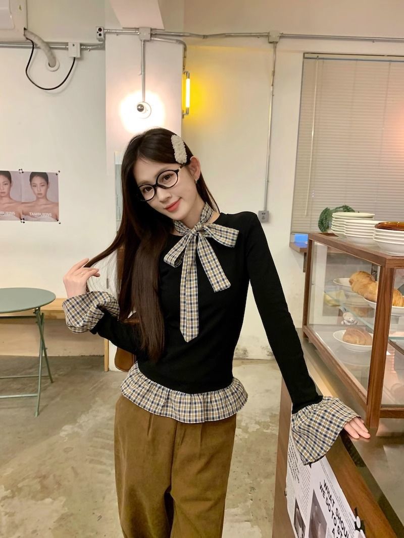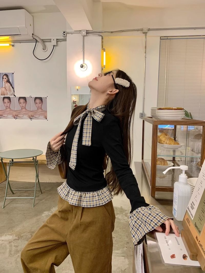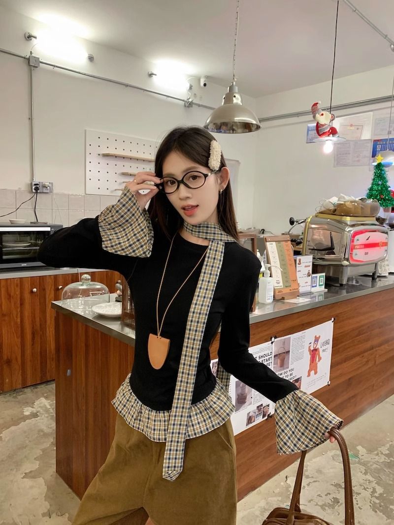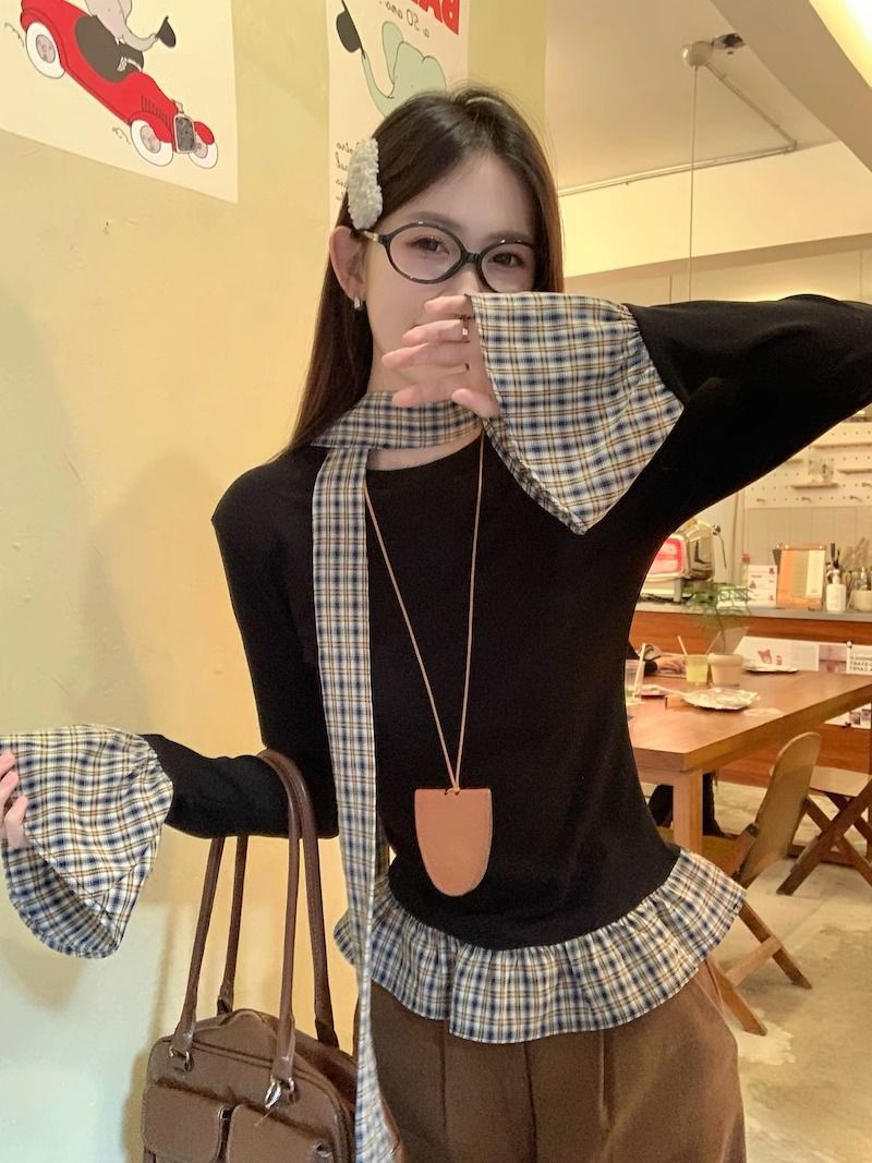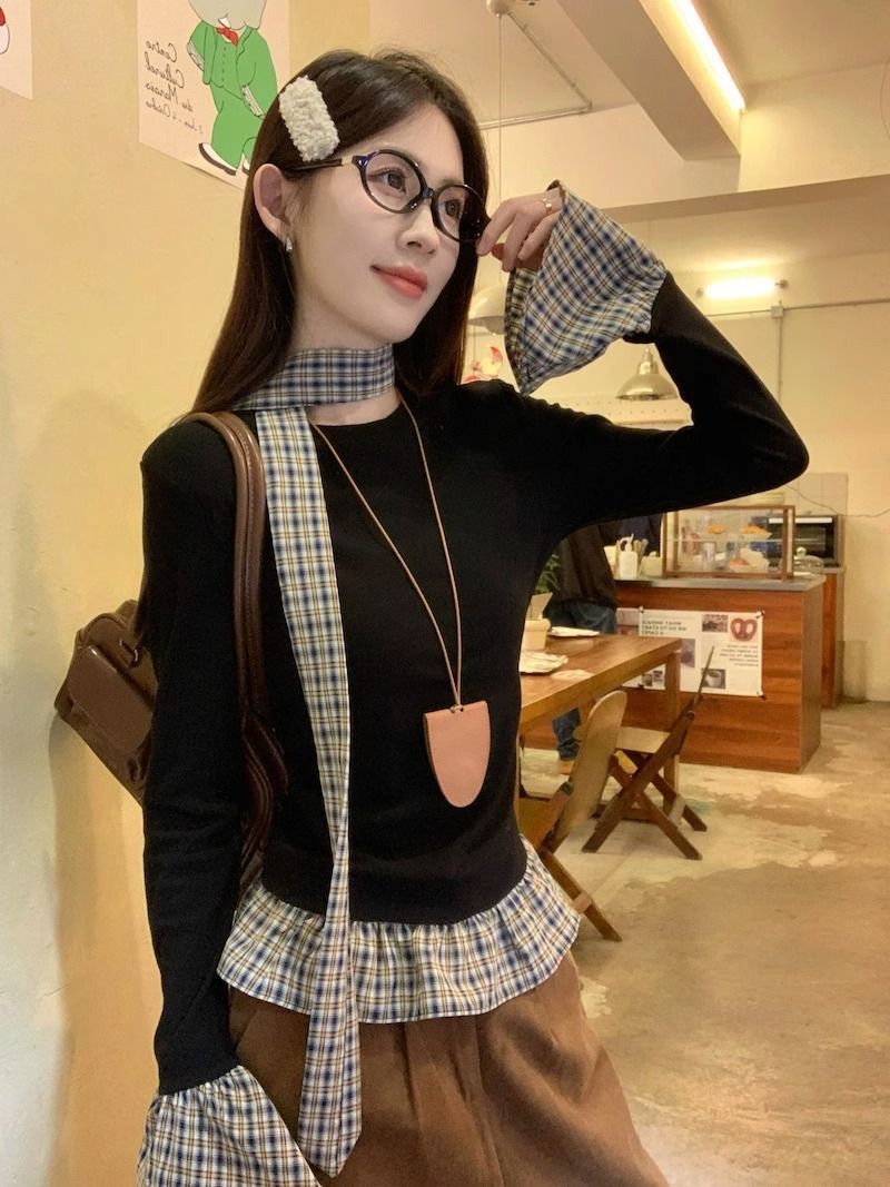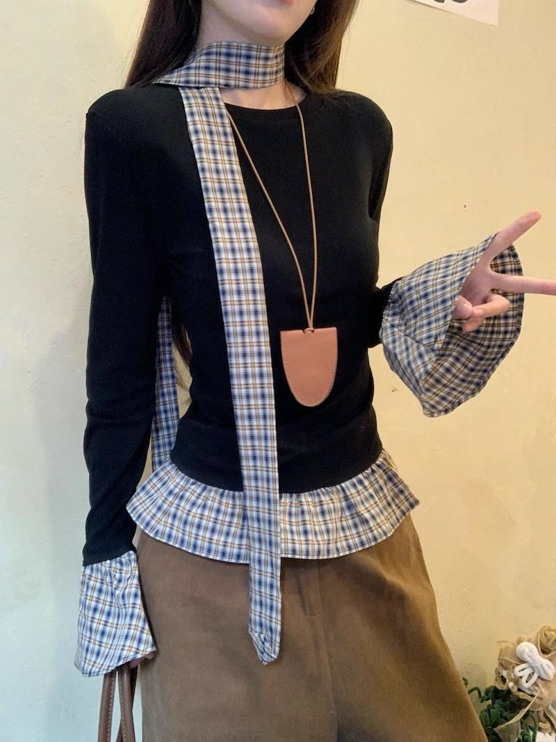 TP096 小众简约设计感格纹荷叶边拼接上衣
