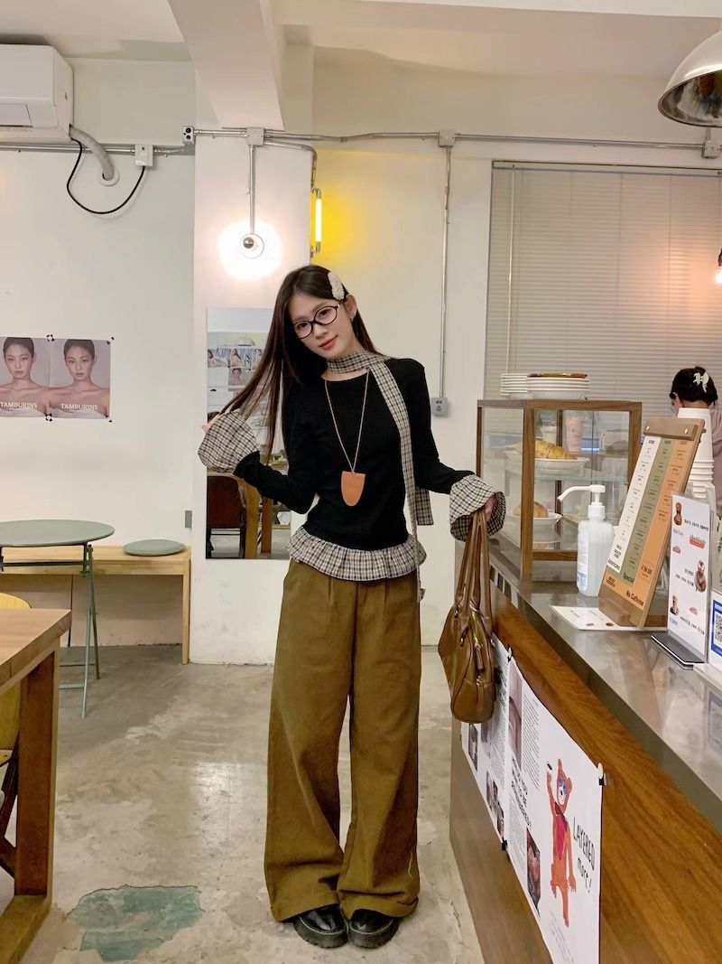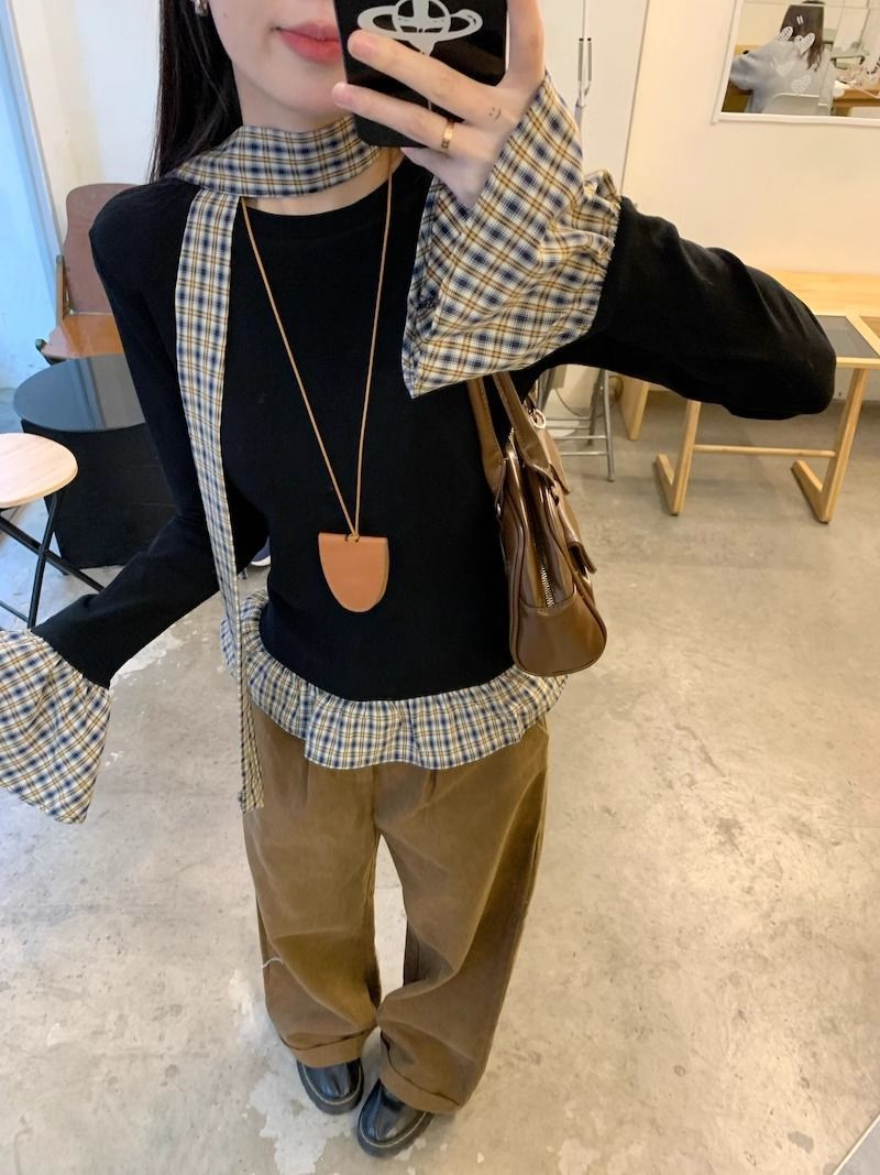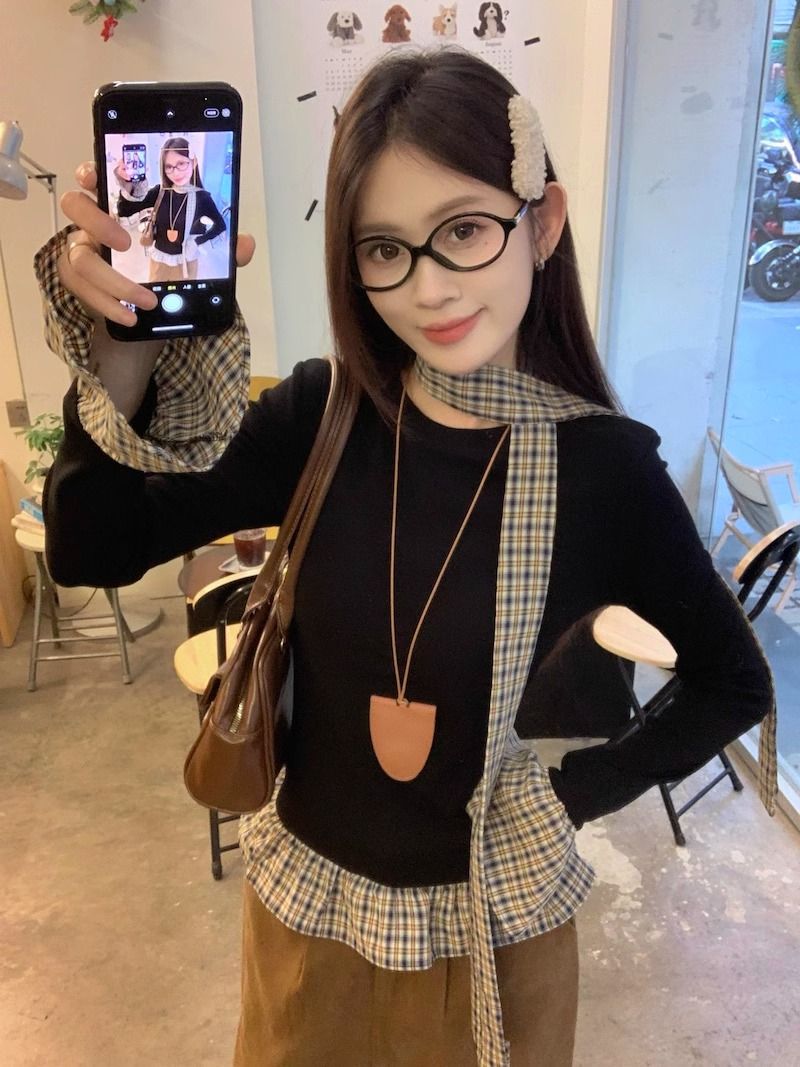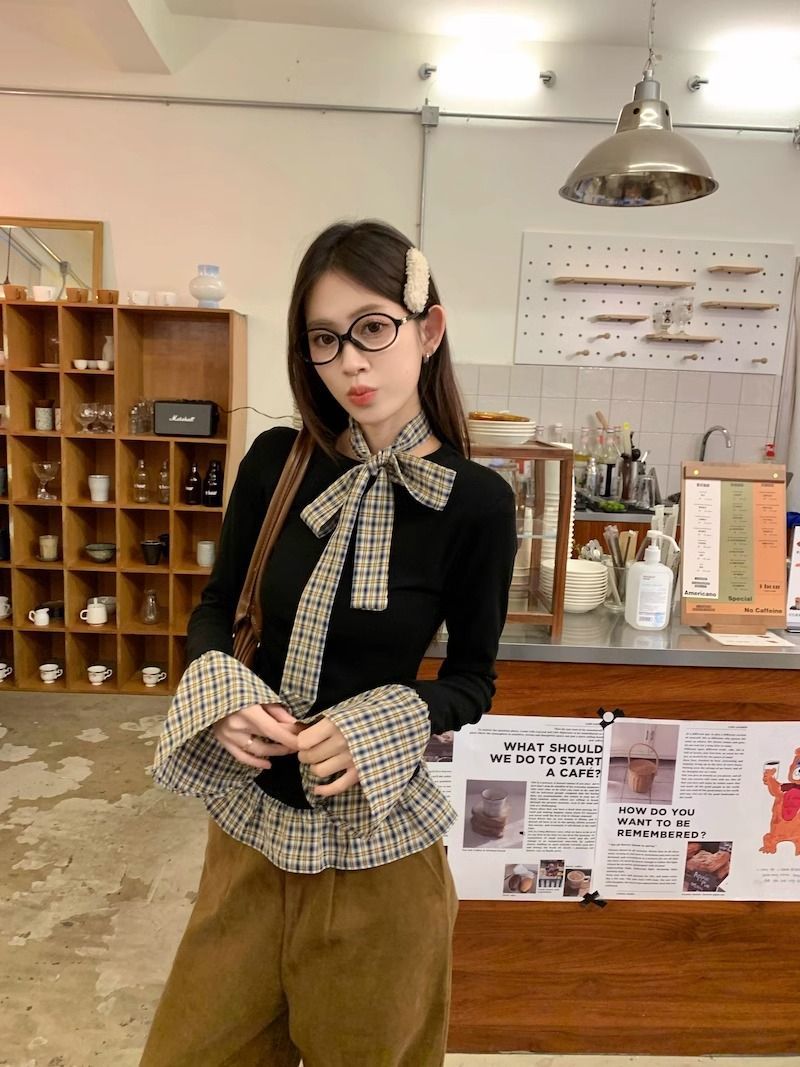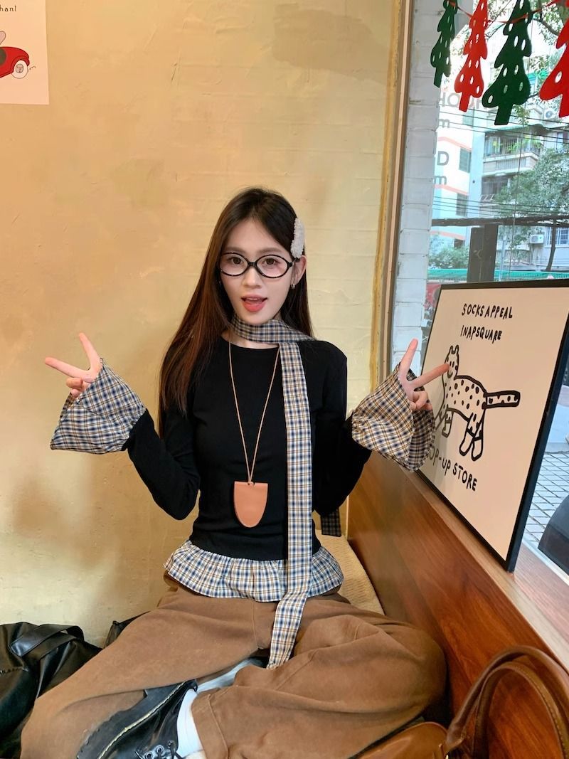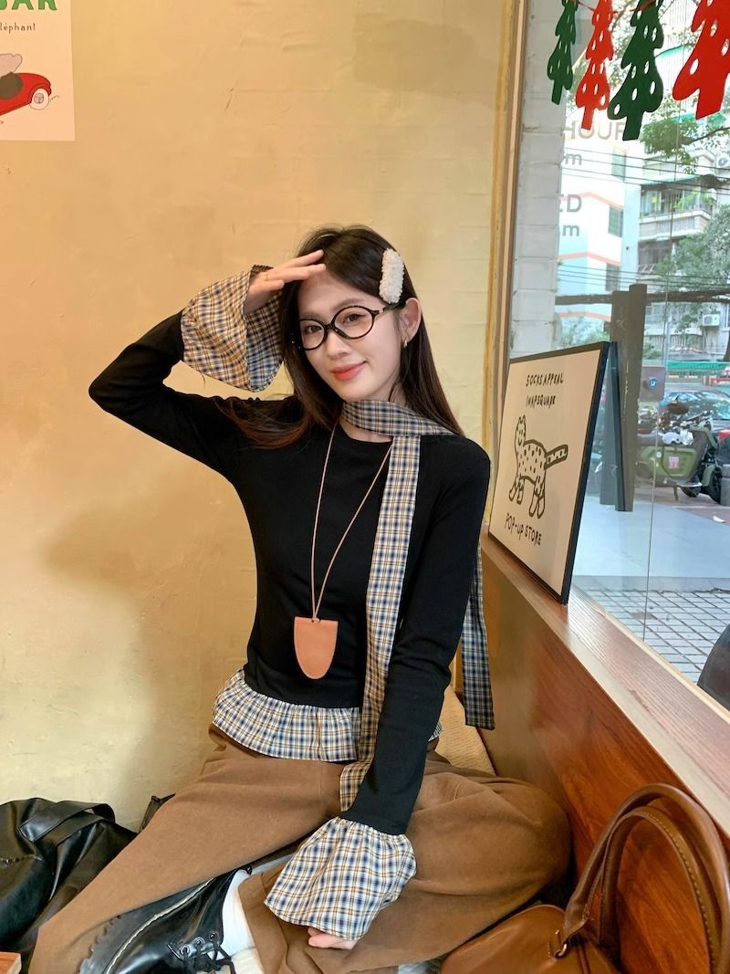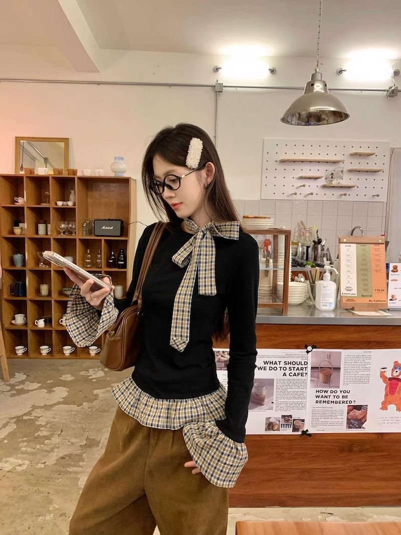 TP096 小众简约设计感格纹荷叶边拼接上衣